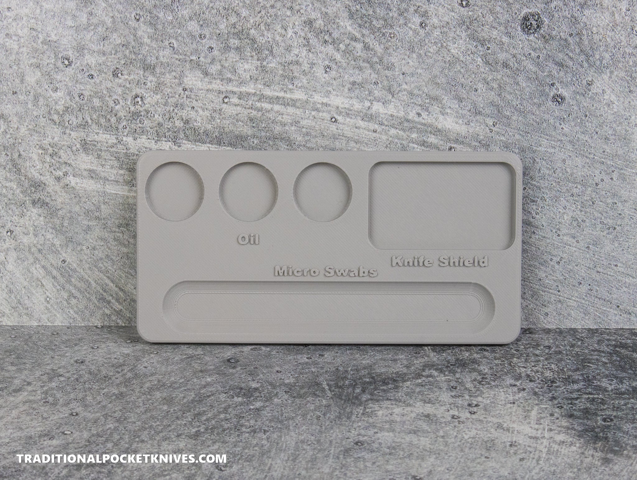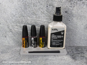 This Accessory Tray keeps you organized while maintaining your knife. It holds 3 bottles of KPL oil, 1 Knife Shield bottle, and includes a slot to keep your Micro Swab brushes in one spot.