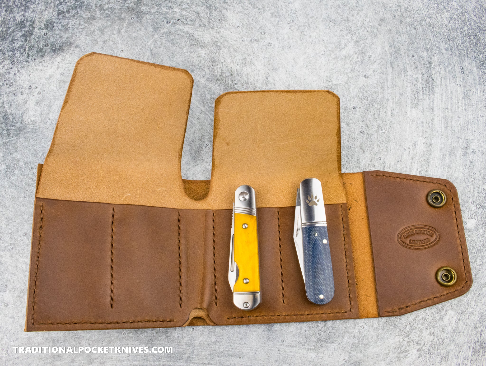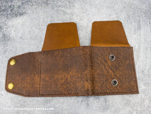 Inspired by the craftsmanship of the knife-maker’s trade, the Cutler’s Wallet is a refined way to stay organized. This hand-made organizer carries 4 traditional slipjoint knives, cash, an EDC pen, cards, stickers, etc. It is the perfect companion for daily carry, travel, or wheeling-and-dealing at your local knife show.  Constructed from 5 oz and 3 oz Italian veg-tan leather.