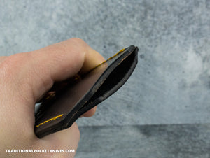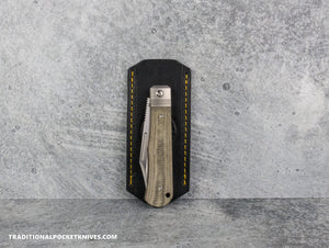 For years, I’ve had the pleasure of collaborating with a skilled leather maker and designer in Oregon to create the perfect knife slips. Crafted from vegetable-tanned leather, these slips are free from harmful chemicals and won’t trap moisture, ensuring your knives stay protected from corrosion or damage. Over time, the leather naturally molds to fit your knife, providing a custom feel. Designed for convenience, you can simply squeeze or push to have your knife ready for use in an instant!