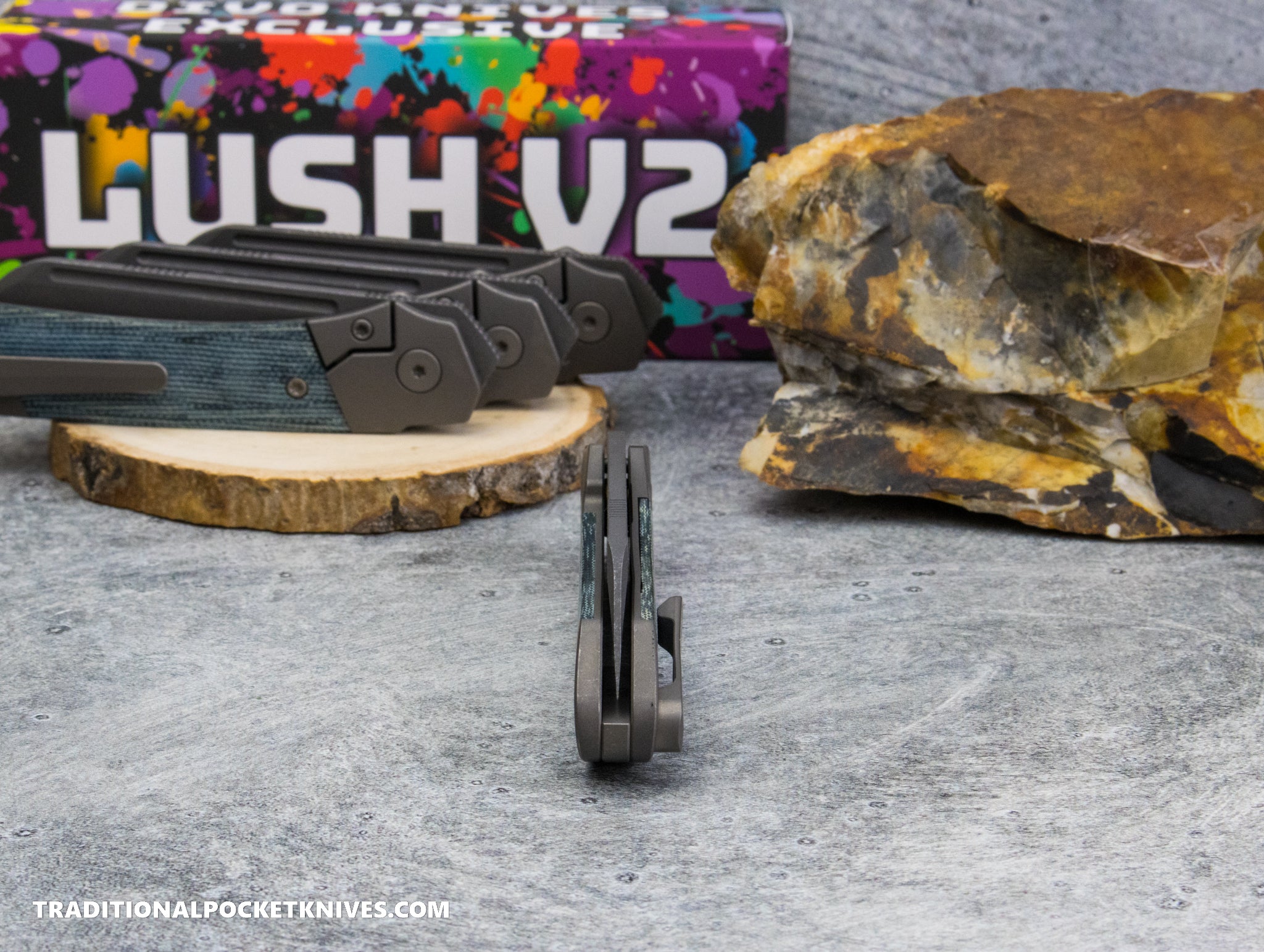 Divo Knives Exclusive Lush V2: Lefty - Blue Denim Micarta Vanax Steel