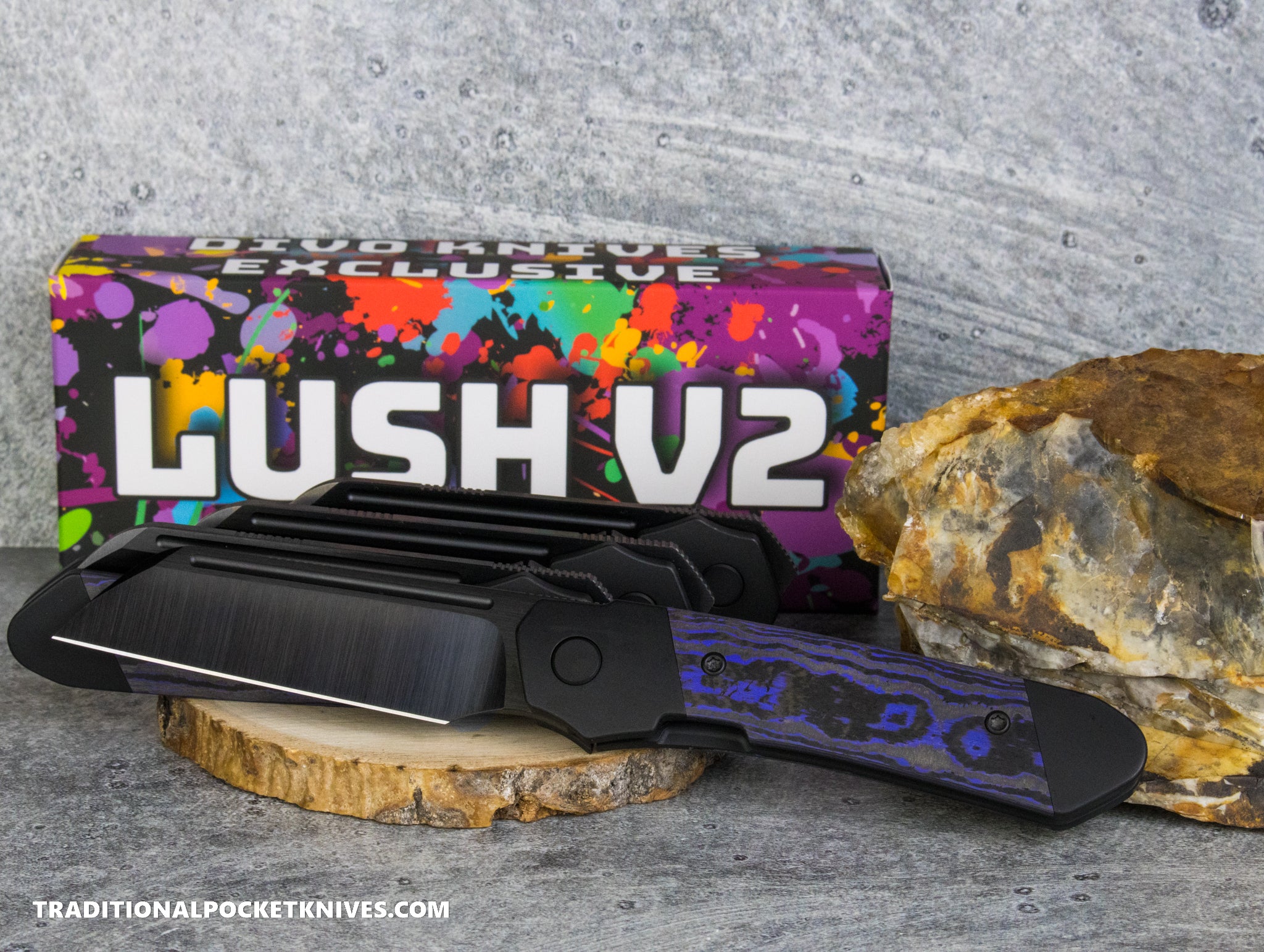 Divo Knives Exclusive Lush V2: Righty - CamoCarbon Purple Flow Vanax DLC Steel