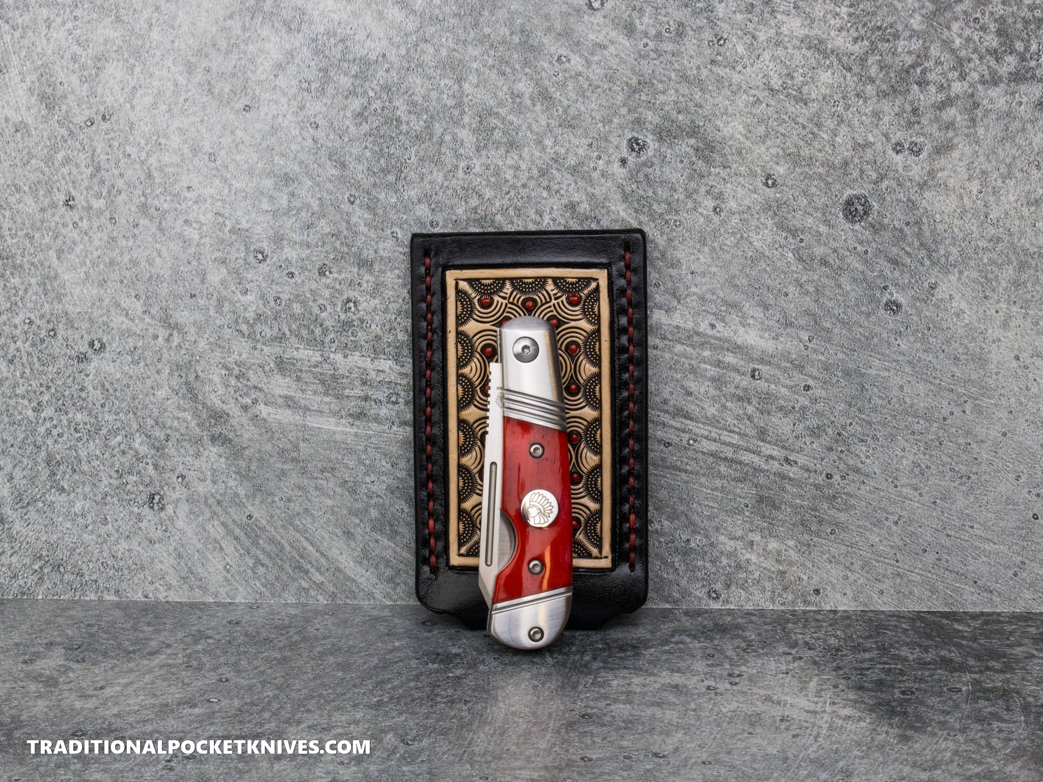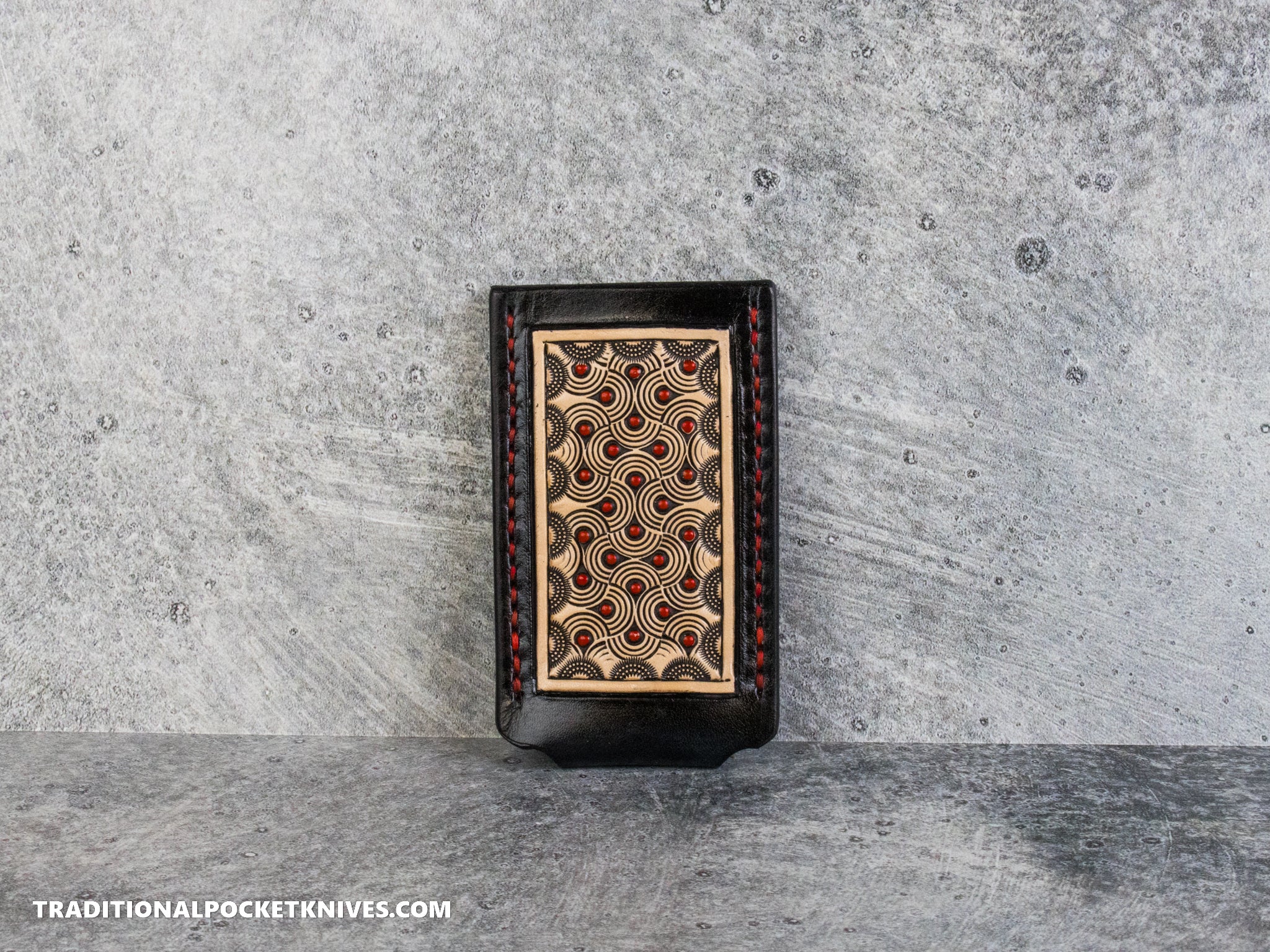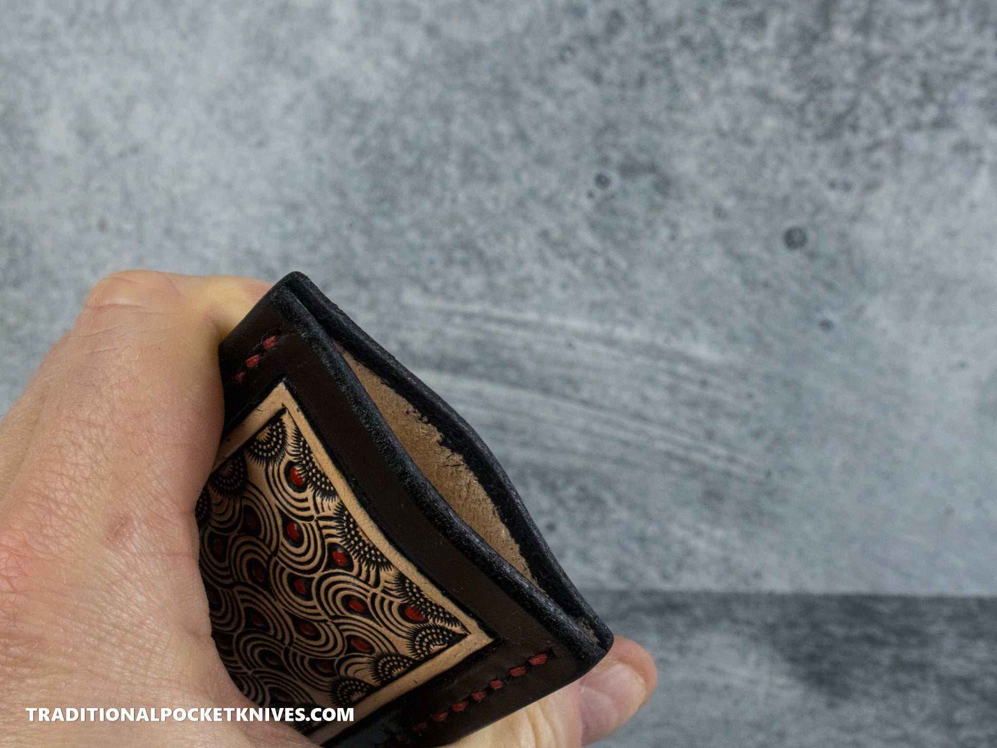 1. Tight is right! I use thick leather to achieve crisp tooling impressions, retain your knife safely and securely, and by gently squeezing the side of the slip, release it easily into your hand. Initially, your slip will be tight but will naturally mold to the knife over a short period of time. There is no need to wet-form the slip.